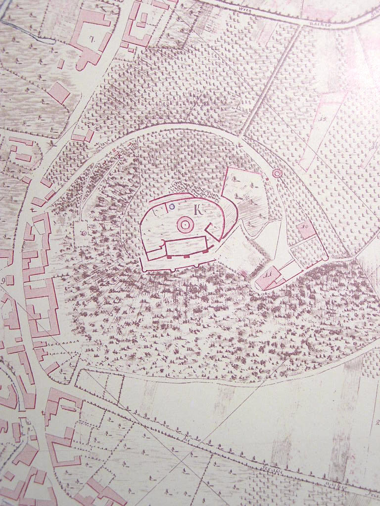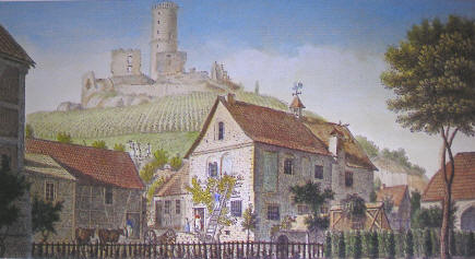 Auf dem Titelblatt der Godesberger Heimatblätter Nr. 36 als Jahresheft des Vereins für Heimatpflege und Heimatgeschichte Bad Godesberg e.V. ist der Blick wiedergeben den Sie auf dem obigen Plan links oben unter Punkt 7 Kapellenhof finden. Zeichnung von Dr. Bernhard Hundeshagen aus dem Jahr 1832. Man beachte die angelegten Weinberge unterhalb der Ruine Godesburg. |