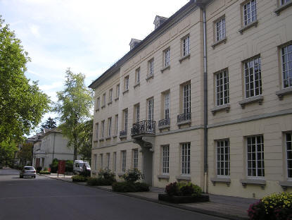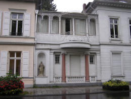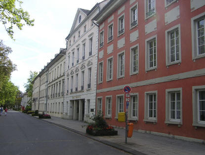 Kurfürstenallee 2 - 3 Das Godesberger Rathaus (Bezirksverwaltung) mit seiner klassizistischen Fassade besteht aus sechs aneinander gebauten Häusern, die 1792-1793 auf Veranlassung von Kurfürst Max Franz errichtet wurden. Die in südlicher Richtung folgen Gebäude haben als Besonderheit eine fortlaufende Nummerierung, da sich früher gegenüber die üppigen Gärten der Villen befanden. Später wurde daraus der Kurpark. |